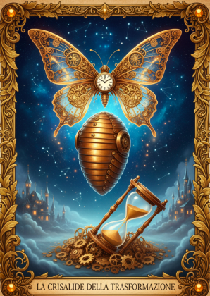 Domina la parte superiore della carta, con ali dorate che sembrano formate da fini ingranaggi e pizzi metallici. Rappresenta la libertà raggiunta non solo attraverso la natura ma attraverso il lavoro costante su se stessi. Al centro del suo corpo si trova un orologio.. Questo indica che la bellezza e la libertà hanno sempre un “tempo di maturazione” perfetto.